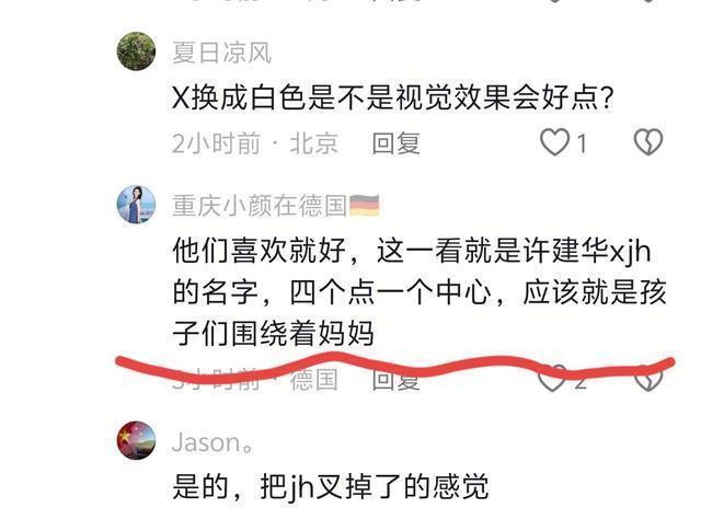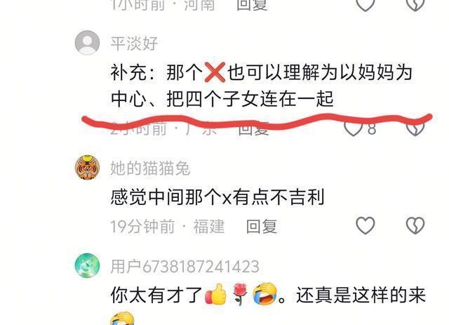 不过也有网友从正面解读这个LOGO:一部分人认为,红色“X”可以理解为以妈妈为中心,将四个孩子连接在一起。 还有人觉得LOGO设计很有深意,正面读是许建华,反过来读是谢浩男,祝福谢妈开业大吉,一路长虹。